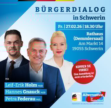 Am 27.02.2026 findet im Rathaus Schwerin ein BÜRGERDIALOG der AfD-Bundestagsfraktion statt. Freuen Sie sich auf unsere Bundestagsabgeordneten Leif-Erik Holm und Hannes Gnauck sowie auf Petra Federau. Freuen Sie sich auf zwei informative und geselligen Stunden. Ich freue mich auf Sie!